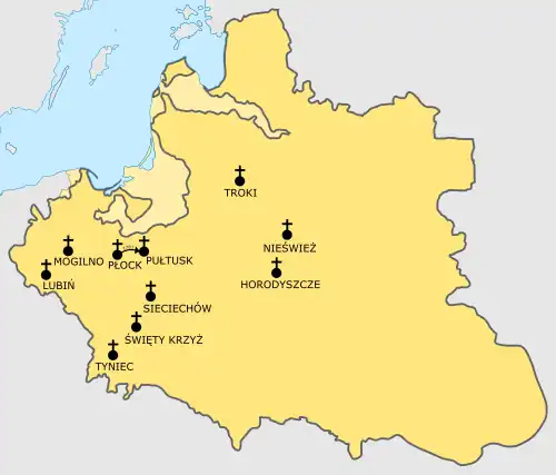 - Płock – ufundowany ok. 1160, w 1781 przeniesiony do Pułtuska, tamtejszy klasztor skasowany w 1864