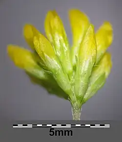 - Zebrane w główkę 5–8 mm średnicy. Występuje do 20 malutkich, żółtych kwiatków. Płatki korony żółte, później ciemnobrązowe.
