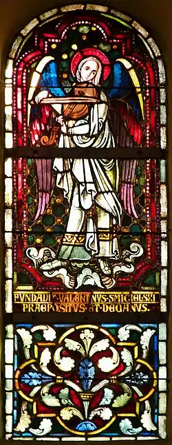 - wokół ołtarza Matki Bożej Częstochowskiej ulokowano, ufundowane przez ks. Śmigielskiego, witraże muzykujących aniołów.