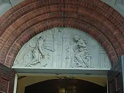 Fasada z portykiem, rozetą wypełnioną witrażami oraz z kompozycją arkadowych wnęk. Portyk z piaskowca posiada kolumnadę oraz tympanon, na którym znajduje się płaskorzeźba Władysława Marcinkowskiego Zwiastowanie. Pod kolumnadą ustawione jest inne dzieło tego autora, pochodząca ze Starego Cmentarza rzeźba nagrobna Pielgrzym, wyrzeźbiona w piaskowcu w roku 1890.