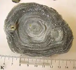 - Konkrecje polimetaliczne pokrywające znaczną część równin abisalnych większości basenów oceanicznych. Tworzą je naprzemianległe warstewki tlenku manganu i wodorotlenku żelaza z dodatkiem innych metali. Ponadto zawierają one inne istotne gospodarczo metale, m.in. nikiel, miedź, kobalt, gal i metale ziem rzadkich[1]. Zostały one odkryte w latach 70. XIX w., jednak możliwość ich wydobycia przemysłowego zaczęto badać dopiero na przełomie lat 50. i 60. XX w.[2] Na przełomie XIX i XX w. ich łączną masę szacowano na 90 mld ton[3]. Prace nad możliwością wydobycia konkrecji polimetalicznych z dużych głębokości, rzędu 4–6 tys. metrów, prowadzone są od lat 70. XX wieku[2].