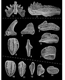 - 1 2 Susan Turner, Carole J. Burrow, Hans-Peter Schultze, Alain Blieck, Wolf-Ernst Reif, Carl B. Rexroad, Pierre Bultynck, Godfrey S. Nowlan. False teeth: conodont-vertebrate phylogenetic relationships revisited. „Geodiversitas”. 32 (4), s. 545–594, 2010. DOI: 10.5252/g2010n4a1. (ang.).