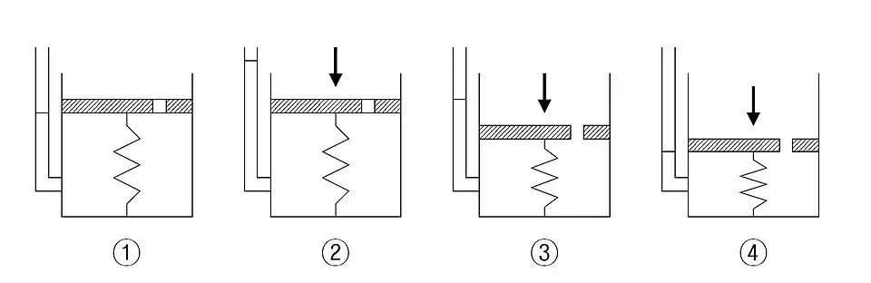 - Gdy tylko otwór zostaje otwarty, woda wypływa z pojemnika i sprężyna zostaje ściśnięta – drenaż nadmiaru wody porowej. Podczas wyciskania wody z porów (odwadniania) następuje przyrost naprężeń efektywnych, które przejmuje szkielet gruntowy (w gruntach organicznych dodatkową rolę może odgrywać ściśliwość cząstek stałych).