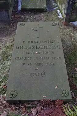 - ↑ Cmentarz Stare Powązki: KONSTANTY GRUSZECKI, [w:] Warszawskie Zabytkowe Pomniki Nagrobne [dostęp 2019-11-05].