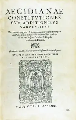 - P. Colliva, Il cardinale Albornoz. Lo stato della Chiesa. Le constitutiones aegidianae (1353-1357). Publicaciones del Real Colegio de Espana, Bologne, 1977.