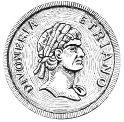 - ↑ Zaobserwowane naruszenia liter legendy dowodzą, że bruzdowanie wykonywano narzędziem grawerskim już po wybiciu całości przedstawienia na krążku (A Dictionary of Roman Coins..., dz. cyt. poniżej, s. 271)