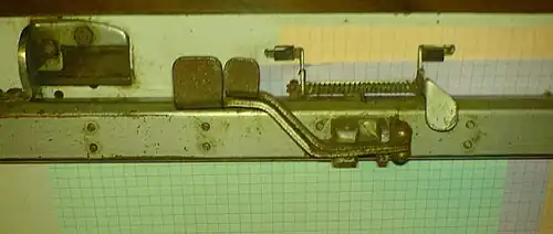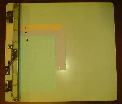 schemat rozmieszczenia formularzy: 1. formularz dziennika, 2. kalka ołówkowa, 3. karta kontowa; z odpowiednimi numerami dźwignie uruchamiające odpowiednie listwy dociskowe