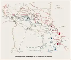 Podejmowane przez polskie dowództwo próby ustabilizowania frontu nie dały rezultatu. Energiczne działania 3 Korpusu Kawalerii Gaji Gaja, który kilkakrotnie obchodził lewe skrzydło wojsk polskich, powodowały, że Armia Czerwona przełamała obronę polską na Niemnie i Bugu i w sierpniu wkroczyła na Białostocczyznę i Podlasie. 10 sierpnia wojska Frontu Zachodniego osiągnęły linię: Mława–Przasnysz–Maków–Wyszków–Węgrów–Siedlce–Łuków–Włodawa, a jego sztab szykował plan zajęcia Warszawy. Plan opierał się na założeniu, że Polacy do obrony stolicy skoncentrują wojska na północ od Bugu, zaś na południu nie będą dysponować siłami zdolnymi do podjęcia działań zaczepnych[2].