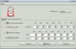 Do limitowania czasu spędzanego przy komputerze, np. do maksymalnie jednej godziny dziennie służy osobna aplikacja TimeKpr[9]. Oprócz limitu czasu, pozwala rodzicom ustalić, w których godzinach dziecko nie będzie mogło korzystać z komputera. Można na przykład zakazać używania komputera w godzinach nocnych od 23 do 7 rano.