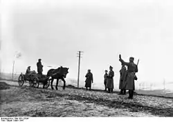 Kontrola chłopskiego zaprzęgu przez patrol niemiecki w dystrykcie lubelskim. Policyjna akcja mająca na celu przeciwdziałanie nielegalnemu ubojowi zwierząt.