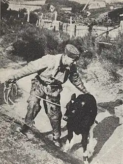 Niemiecki żołnierz konfiskuje cielę na polskiej wsi.