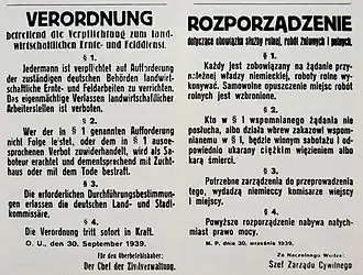 Rozporządzenie obowiązku służby rolnej, robót ziemnych i polnych z dnia 30 września 1939 roku przewidujące karę śmierci za uchylanie się od pracy.