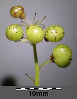 - Kulista jagoda, zawierająca 1–2 kuliste nasiona. Początkowo zielona, po dojrzeniu czerwona.