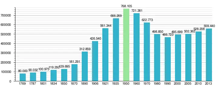 - Wykres liczby ludności Kopenhagi na przestrzeni ostatnich 245 lat