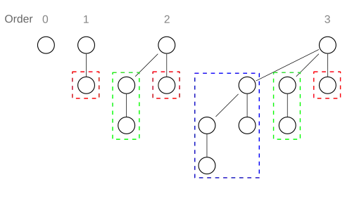 - drzewo dwumianowe rzędu 0 składa się z jednego węzła (korzenia);