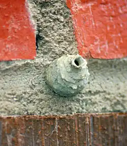 Samice w nasłonecznionych miejscach, budują z delikatnej gliny dzbanuszkowate, jednokomórkowe gniazda przyczepione do muru lub sztywnych roślin. Do wnętrza składają jedno jajo i gąsienicę służącą za pokarm. Następnie komórkę zamykają znacznie węższym, stożkowatym wieczkiem z otworem.