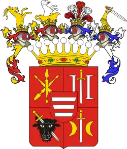W pierwotnej, XV wiecznej formie w klejnocie znajdowała się głowa szczenięcia srebrnego między kręgami srebrnymi ze środkiem czerwonym i okrągłymi uchwytami srebrnymi[13]. Herb ma pochodzenie węgierskie, trzy wręby oznaczają trzy rzeki Dunaj, Cisę (lub Drawę) i Sawę[14].