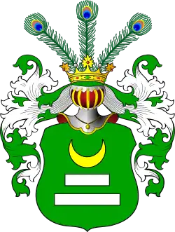 W polu zielonym, pod złotym półksiężycem – dwie poprzeczne belki, czyli wręby srebrne, równoległe, wyższa krótsza, niższa dłuższa. W klejnocie trzy pióra pawie.
