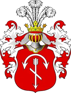 W polu czerwonym, pod półkolem srebrnym, barkiem do góry odwróconym i z obu stron żeleźcem zakończonym, strzała prosto do dołu, w środku prawo-ukośnie przekrzyżowana. W klejnocie trzy pióra strusie.