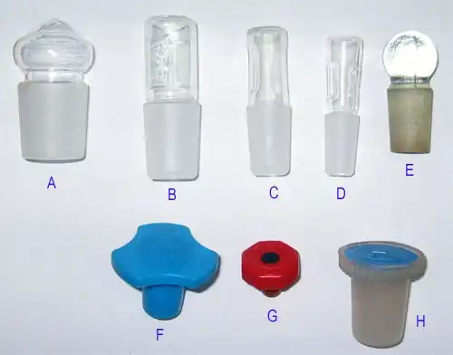 Korki wykonane ze szkła (A–E na rysunku) składają się z główki oraz ze szlifu męskiego. Szlify w korkach są takie same jak te, które występują w innych elementach aparatury laboratoryjnej. Główki przybierają najróżniejsze kształty, z których dwa najbardziej popularne to kapelusz (A), kulka (E) i spłaszczony pręt (B, C, D). Dawniej korki wykonywane były z litego szkła (E). Produkowano je przez odlewanie w formie i ręczne szlifowanie boków. Obecnie częściej spotyka się lżejsze i bardziej odporne na stłuczenie korki "dmuchane", tj. wykonywane przez rozdmuchanie i zatopienie końca krótkiej rurki szklanej ze szlifem, który to proces jest wykonywany w całości przez maszyny (A–D).