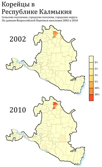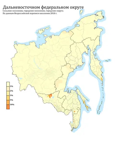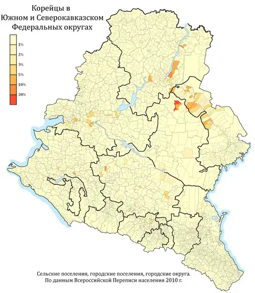 Natomiast spis ludności z 2010 roku wykazał, że Rosję zamieszkuje 153 156 Koreańczyków, tym razem ponad połowa mieszkała w europejskiej części Rosji, jednak Dalekowschodni Okręg Federalny wciąż pozostaje Okręgiem Federalnym z największą liczbą Koreańczyków.