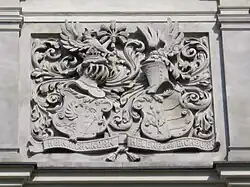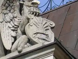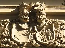 - ↑ Pałac zbudowano w latach 1891–1895), prawdopodobnie według projektu Augusta Ortha; na zdjęciu pokazany jest budynek główny ozdobiony herbami Heinricha von Korn i jego żony Heleny z domu von Eichborn; obok głównego budynku pałacu znajduje się połączony z nim osobny i mniej okazały budynek, przyozdobiony nad wejściem herbem córki von Kornów - Marii oraz jej męża Constantina von Schweinichen; przed frontowym wejściem pałacu widoczna jest kamienna okrągła podstawa, dziś pusta, na której do 1945 znajdował się nagrobek ostatniej Świnkowej na Świnach, Erdmuthe Sophie z domu von Zedlitz (1665 – 1729), odnaleziony przy robotach kanalizacyjnych w Jaworze około roku 1890.