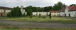 - ↑ Do Fideikommissrittergut (ordynacji) należy duże gospodarstwo rolne, w skład którego prócz obór, chlewów i stajni (zbudowanych w 1892) wchodził także młyn (1891), wieża wodna, magazyny i dom zarządcy (wszystkie ukończone w 1895) oraz kuźnia (1900). Całość liczącą 347,8 ha uzupełniała mleczarnia i gorzelnia; w roku 1936 zapłacono tu podatek roczny 9671 RM
