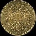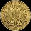 10 koron | 1908 (60 rocznica panowania Franciszka Józefa I) | złoto 900 | 3,3875 g | 19 mm | ![]() | |
