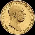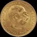 10 koron | 1909, 1910, 1911, 1912 (jak poprzednia, lecz z powiększonym wizerunkiem Franciszka Józefa I) | złoto 900 | 3,3875 g | 19 mm | ![]() | |