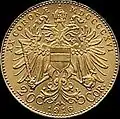20 koron | 1908 (60 rocznica panowania Franciszka Józefa I) | złoto 900 | 6,7751 g | 21 mm | ![]() | |