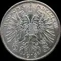5 koron | 1909 (jak 5 koron z 1907 r., lecz z powiększonym wizerunkiem Franciszka Józefa I) | srebro 900 | 24,0 g | 36 mm | ![]() | |