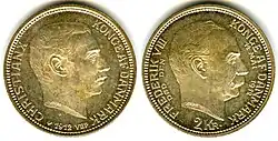 - monety złote o nominałach 10 i 20 koron (waga odpowiednio: 4,48 i 8,96 g; nakład w milionach odpowiednio: 4,6 i 1,2). Na awersie ukazano wizerunek Fryderyka VIII zwrócony w lewo i napis: Fryderyk VIII król Danii. Na rewersie wielki herb Danii pod koroną i w płaszczu gronostajowym, nominał i rok.
