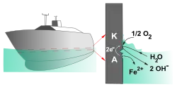 Stal (anoda) utlenia się wokół bardziej szlachetnych śrub (katody, redukcja tlenu). Rdza powstaje w wyniku wtórnej reakcji chemicznej między jonami powstającymi na obu elektrodach.