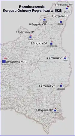 W końcu 1929 KOP składał się z Dowództwa KOP, 6 dowództw brygad, 4 dowództw pułków, 24 batalionów granicznych, 5 batalionów odwodowych, 20 szwadronów kawalerii, batalionu szkolnego, szkoły podoficerów zawodowych kawalerii, szkoły tresury psów meldunkowych, dywizjonu żandarmerii, 9 placówek wywiadowczych. Stan osobowy wynosił około 27 000 ludzi[76][77].
