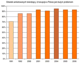 W 1991 roku odsetek twierdzących, iż korupcja jest problemem dużym wynosił 71%. Od tamtego czasu odsetek ten wciąż rósł, osiągając dotychczasowo największą wartość w maju 2005 roku (95%). Również zmienia się liczba osób uważających, iż korupcja w Polsce jest problemem małym – w 1991 było to 17% osób, w 2006 zaledwie 2%.