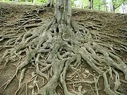 System korzeniowy roślin drzewiastych rozwija się asymetrycznie, dostosowując się do przeważających dla lokalizacji kierunków wiatru. Duże znaczenia dla stabilności drzew ma głębokość, do jakiej docierają korzenie. Jednak ograniczeniem wzrostu w głąb podłoża jest często zwierciadło wód podziemnych. Korzenie kotwiczące drzewo w wyniku przyrostu wtórnego uzyskują zwiększoną gęstość w swej części górnej oraz w pionie. W efekcie układ zagęszczonych elementów korzenia przypomina na przekroju belkę T, po stronie zawietrznej. Po stronie nawietrznej dochodzi do zagęszczenia, które na przekroju przypomina belkę I[31]. Rośliny drzewiaste o palowym systemie korzeniowym wzmacniają swoje korzenie głównie w wyniku drewnienia. Dodatkowo, aby zapewnić sobie mocowanie w podłożu mogą wytwarzać dodatkowe korzenie podporowe (np. kukurydza wytwarza krąg wzmocnionych korzeni przybyszowych)[32]. Dodatkowe korzenie tworzą naturalny system przyporowy[33].