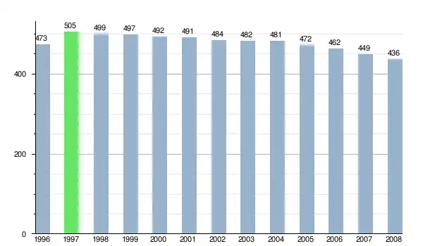Według danych z dnia 31 grudnia 2012 roku, wieś zamieszkiwało 455 osób, w tym 252 kobiety i 203 mężczyzn[6].