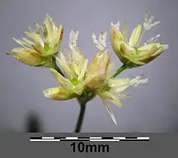 - Zebrane są w kwiatostan w formie baldachowatej rozrzutki. Wyrastają w skupieniach po 2–6 na wzniesionych szypułkach. Osiągają 2,5 do 3,5 mm długości. Składają się z 6 lancetowatych i ostrych listków okwiatu (te z zewnętrznego okółka są nieco krótsze[9]), białawych (u podgatunku luzuloides) lub brązowawych (u podgatunku cuprina). Szyjka górnego słupka zwieńczona jest trzema nitkowatymi znamionami. Pręcików jest sześć i są one krótsze od okwiatu[6].