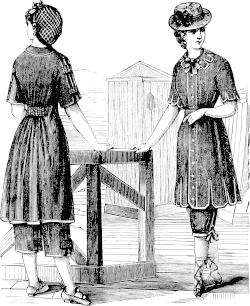 Potrzeba kostiumu kąpielowego jako specjalnego ubioru pojawiła się w połowie XIX wieku, w miarę popularyzacji wypoczynku nad morzem i stopniowej akceptacji wspólnego korzystania z plaży przez kobiety i mężczyzn. W latach 40. XIX wieku, by umożliwić kobietom większą aktywność niż tylko zanurzanie się w wodzie, do stroju kobiecego wprowadzono zyskujące wówczas popularność pantalony, a część wierzchnia została zebrana w pasie i skrócona[1]. Taki też kształt zyskały kobiece stroje kąpielowe: składały się z odcinanej w pasie sukni z rękawami, ze spódnicą sięgającą łydek, a później kolan, pantalonów, początkowo długich do kostek, potem do kolan oraz pończoch. Stopy były chronione przez specjalne obuwie, często ze wstążką zawiązywaną wokół łydki. Suknie były wykonywane z wełnianej flaneli lub serży w ciemnych kolorach, na których mniej było widać zamoczenie w wodzie. Ta jednostajna kolorystyka była ożywiana kontrastującymi wstawkami czy innymi elementami, jak np. marynarskie kołnierze. Krój kostiumu i dodatki do niego, takie jak chroniące włosy czepki, turbany i kapelusze, były pochodną aktualnej mody i zmieniały się z sezonu na sezon. Uzupełnieniem stroju plażowego był płaszcz kąpielowy, mogący przykryć mokry i nieatrakcyjnie wyglądający wełniany kostium podczas przejścia z wody do przebieralni[4]. Pod kostiumem noszono gorset[5].