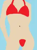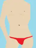 Bardzo skąpo skrojony strój dwuczęściowy. Górną część tworzą trójkątne skrawki materiału, które zasłaniają niewiele więcej ponad brodawki sutkowe. Dół natomiast to bardzo wykrojone stringi[23] |