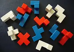 Łamigłówka składa się z 12 elementów stworzonych z 5 sześcianów oraz jednego, który składa się z czterech sześcianów.
