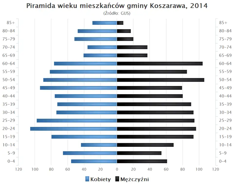 - Piramida wieku mieszkańców gminy Koszarawa w 2014 roku[1].