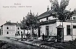 ![]() Widok koszar kawalerii od strony ulicy Kazimierza Wielkiego (1899) | |