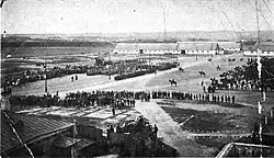 Na terenie garnizonu wołkowyskiego funkcjonował kompleks koszarowy położony tuż przy stacji kolejowej, w rejonie dzisiejszych ulic: Czyrwonaarmiejskaja – Żołudzewa – 9 Maja. Parcela miała kształt trójkąta, drewniane stajnie i działownie zostały zgrupowane po jej zachodniej stronie, a oddzielone od nich placem apelowym murowane koszary i drewniane budynki mieszkalne – po wschodniej. Koszary oddane zostały do użytku w 1890, a do 1914 kwaterowała w nich rosyjska 16 Brygada Artylerii[1].