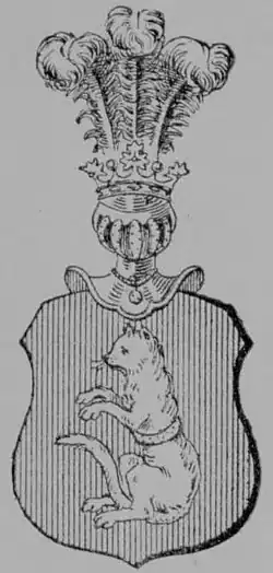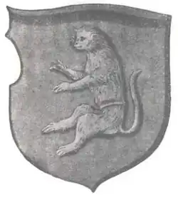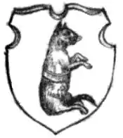 Na tarczy w polu czerwonym kot srebrny siedzący, z ogonem między tylnymi łapami, z przednimi łapami uniesionymi i ze złotą przepaską wpół.