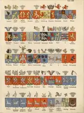 - ↑ Należy pamiętać, że zgodnie z zasadami blazonowania, lewa strona herbu odnosi się do rycerza trzymającego tarczę, zatem dla patrzącego na rysunek, lewa strona opisu jest prawą stroną na rysunku.
