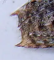 Szersze niż dłuższe przedplecze ma parę błyszczących guzków w przedniej połowie, a po bokach parę ostrych wyrostków. Barwa tarczki jest ciemna z jaśniejszą linią przez środek. Pokrywy są ku tyłowi zwężone, a u wierzchołka wykrojone tak, że zarówno kąty wierzchołkowo-zewnętrze, jak i kąty wierzchołkowo-wewnętrzne przedłużone są w ostre ząbki; ząbek zewnętrzny skierowany jest mniej lub bardziej prosto ku tyłowi. Przednie brzegi pokryw po bokach tarczki są czarnobrązowe, a dalej znajduje się szeroka przepaska poprzeczna z białoszarego owłosienia, która w połowie długości pokryw zakończona jest wąską przepaską poprzeczną czarną. W tylnej połowie owłosienie pokryw tworzy rudobrązowe, białoszare i czarne marmurkowanie, a przy szwie i kącie zewnętrznym naprzemienne, białoszare i czarnobrązowe nakrapianie. Na powierzchni pokryw obecne są po trzy podłużne żeberka, z których wewnętrzne mają po bokach trzy lub cztery kępki czarnych włosków. Odnóża są czarnobrązowo, czerwonobrązowo i szaro obrączkowane, o maczugowato zgrubiałych udach[5][3].