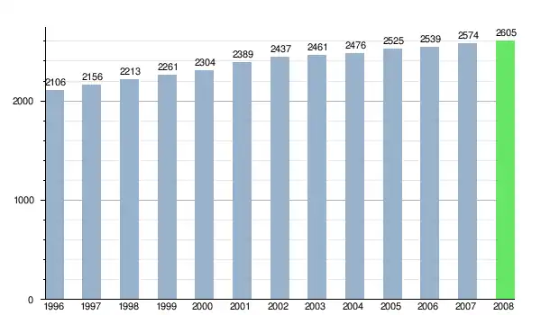 Według danych z dnia 31 grudnia 2012, wieś zamieszkiwały 2603 osoby, w tym 1330 kobiet i 1273 mężczyzn[6].