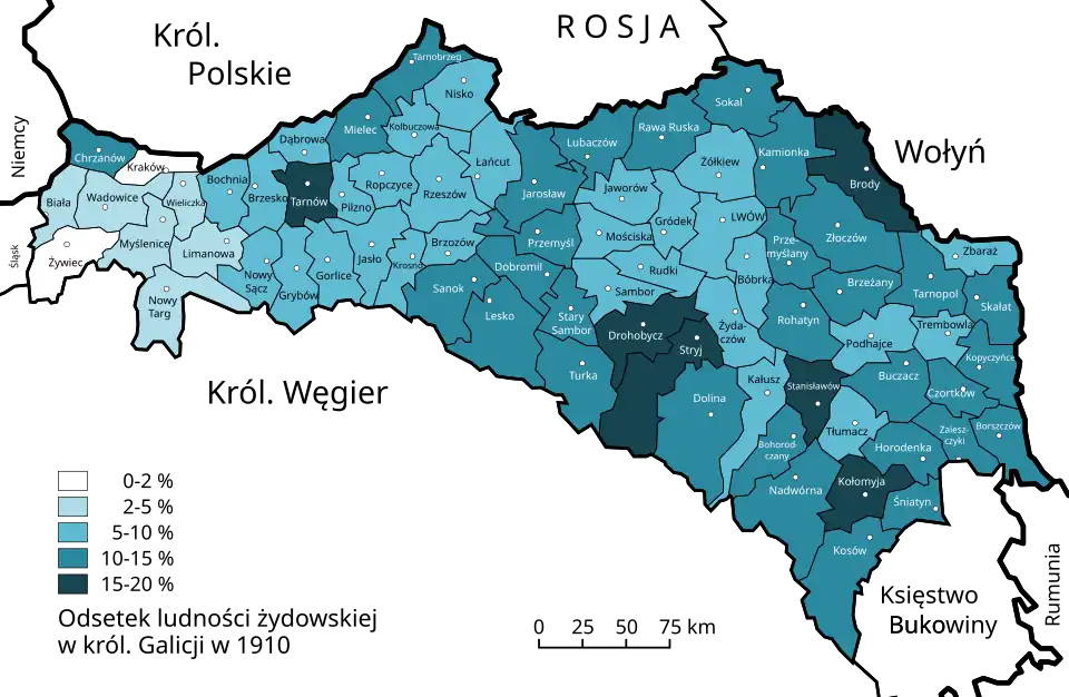 Skład etniczny na podstawie spisu ludności z 1910 z podziałem na Galicję Wschodnią i Zachodnią[16][17][18]: