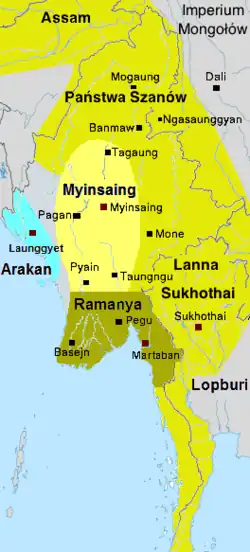 Po swoim najeździe z 1287 r. Mongołowie posunęli się dalej na południe aż do Tagaung, ale wzbraniali się przed wypełnieniem próżni politycznej, jaką sami stworzyli. W istocie, cesarz Kubilaj-chan nigdy oficjalnie nie zaaprobował faktycznej okupacji Paganu[49]. Wydaje się, że jego rzeczywistym celem było „utrzymanie całego regionu Azji Południowo-Wschodniej w stanie rozbicia i podziału”[51]. W maju 1289 r. jeden z synów Narathihapatego – Kyawswa – objął tron Paganu. Jednak władza nowego „króla” obejmowała jedynie niewielki obszar wokół miasta, nie dysponował on też żadną armią. Rzeczywista władza w Górnej Birmie znalazła się teraz w rękach trzech braci, dawnych wodzów armii Paganu, z pobliskiego Myinsaing. Gdy królestwo Hanthawaddy z Dolnej Birmy zostało w 1294 r. wasalem Sukhothai, to właśnie wspomniani bracia, a nie Kyawswa, wysłali armię by odzyskać władzę nad dawnym terytorium Paganu. Chociaż armia ta została odparta, nie było już żadnych wątpliwości kto dysponuje realną siłą w środkowej Birmie. W następnych latach bracia, a zwłaszcza najmłodszy z nich – Thihathu, w coraz większym stopniu działali z pozycji suwerenów[52].